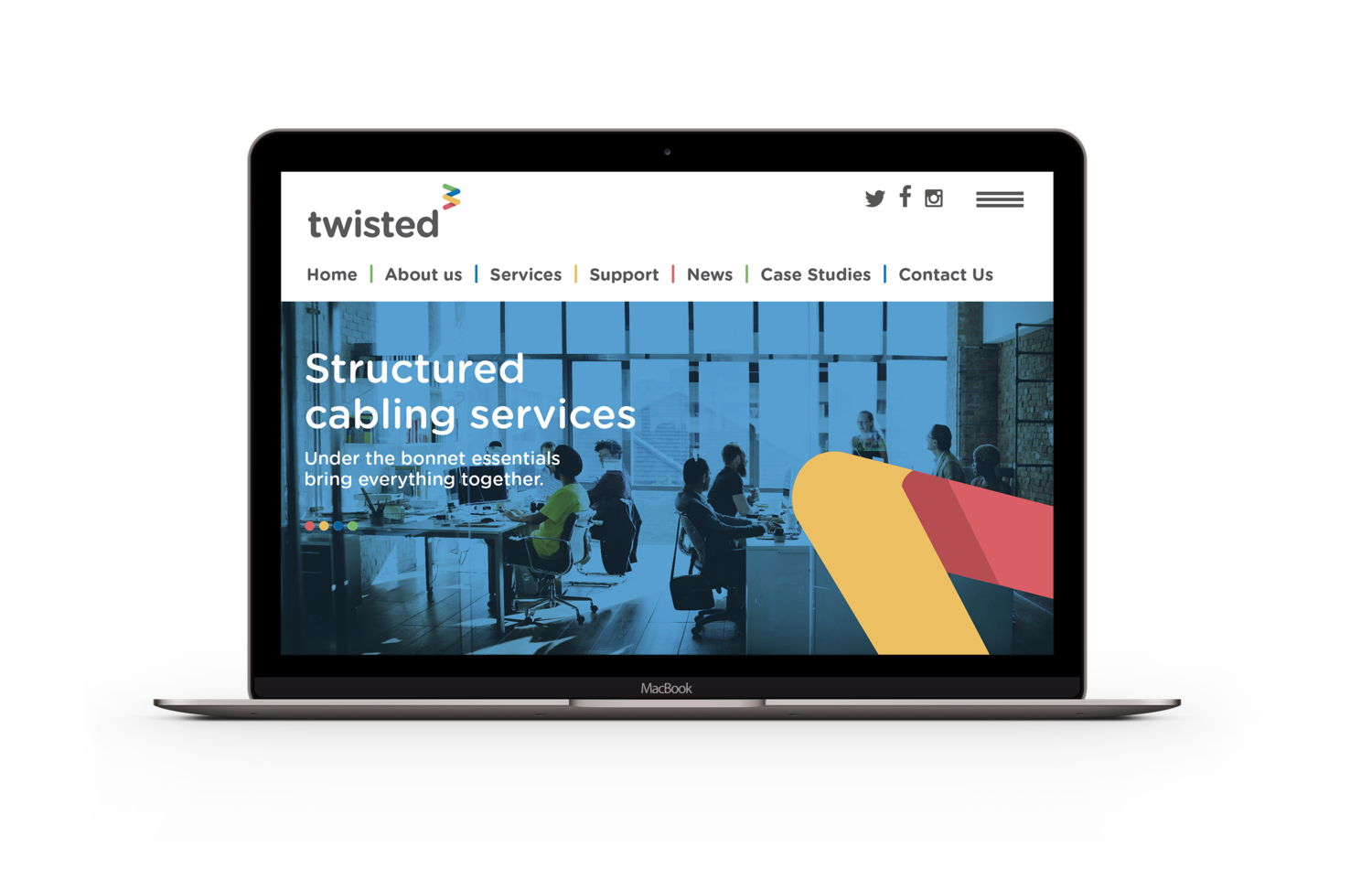 Twisted (formally know as TwistedPair) are a cabling and audio company based in Hampshire. For this brief, I took a trip into the Twisted offices to get to know how they work and their environment. I was inspired by all the data and server cabinets full of intertwining cables. They showed us how each colour of cable represented a different connection. I decided to subtly imply this within my branding.